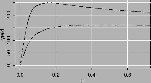 As may be seen the catches will be steady in the nearest future if M=0.1 is a correct assumption. If M=0.05 is correct the catches should be decreased if F=F0.1 is the catch rule. Figures 3.8 and 3.9 show development of the catches in near future for 4 different values of F. The lowest F is close to Fmax (figure 3.5). In all cases the catchable biomass increases in the beginning but starts to decrease late in the period. If the groundfish survey is to be accepted as a measure of recruitment no new yearclass will show up in the catch until 2010 so the 1985 and 1990 yearclasses need to be preserved at least until then.