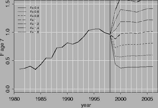 Figures 5.11 to 5.13 show then the catchable biomass, catch and fishing mortality of age 7 haddock using F = 0.5 after 1998.